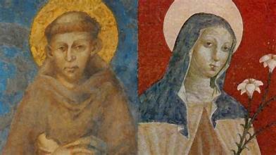 Avant de louer Dieu pour les merveilles de la création, avant de se contenter de peu de choses pour vivre, François a opéré une CONVERSION RADICALE. Fils d’un riche marchand de tissus à Assise, il voulut donner son héritage aux pauvres … malgré l’opposition de son père. De même Claire, elle renonça à une vie luxueuse et, avec François, elle a fondé une communauté féminine donnée à Dieu et aux pauvres.