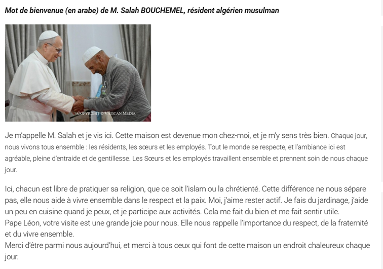 Je remercie M. Salah Bouchemel pour son témoignage, si beau et si réconfortant. Je pense que le Seigneur, depuis le Ciel, en voyant une maison comme celle-ci, où l’on cherche à vivre ensemble dans la fraternité, peut se dire : alors, il y a de l’espoir ! Oui, car le cœur de Dieu est déchiré par les guerres, les violences, les injustices et les mensonges. Mais le cœur de notre Père n’est pas avec les méchants, avec les tyrans, avec les orgueilleux : le cœur de Dieu est avec les petits, avec les humbles, et c’est avec eux qu’il fait avancer son Royaume d’amour et de paix, jour après jour. Comme vous essayez de le faire ici dans votre service quotidien, dans votre amitié, dans votre vie commune. Merci, chères sœurs et chers frères, pour cette rencontre ! Je vous porte dans ma prière et je vous donne de tout cœur ma bénédiction.