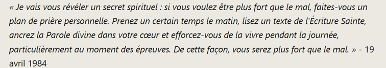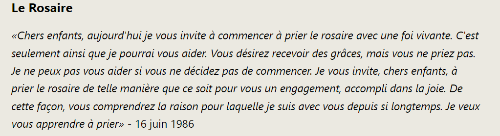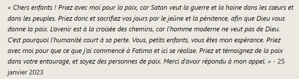 En général, les gens prient peu, vraiment trop peu. Or le monde va mal. Dieu merci, des congrégations de religieux et religieuses se consacrent totalement à la prière à laquelle Marie ne cesse de nous appeler. Ils sont les racines de l’arbre sans lesquelles la civilisation ne peut tenir.