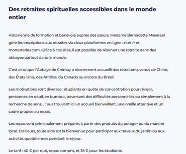 L’historienne Bernadette Masereel nous a raconté en détails l’histoire de la fondation de l’abbaye Notre-Dame de la Paix à Chimay. Je retrouve certains de ses propos sur le site de l’abbaye site qu’elle a créé elle-même et qu’elle continue d’alimenter. Remarquez que les laïcs, selon leurs dons, jouent un rôle important dans la vie des monastères.