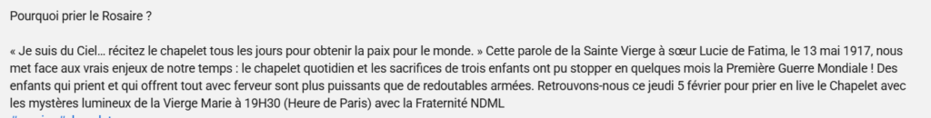 ❤️ Soutenez l’Asso NDML pour 2025-2026 : https://donorbox.org/rentree-ndml-2025 📩 Retrouvez ce chapelet chaque jour : En Mail : https://ndml.fr/inscription-chapelet En Podcast : https://podcast.ausha.co/ndml-chapelets Sur Hozana : https://hozana.org/t/BzwzD Sur YouTube :    • CHAPELET du JOUR en LIVE – Prier le Rosaire   🌹 SOUTENIR NOS ACTIONS : 🆘 Aidez notre mission humanitaire au Liban : https://ndml.fr/u/liban 🇱🇧 🆘 Aidez le Congo : https://ndml.fr/u/congo 🆘 Sauvez les femmes de la prostitution : https://www.ndml.fr/sos/ ❤️ Soutenez « Open Bible » : https://www.open-bible.fr/dons ❤️ Aidez les Missions d’Evangélisation de la Fraternité NDML : https://ndml.fr/u/dons La Boutique NDML : https://boutique.ndml.fr/ 💌 LAISSER NOUS VOTRE TEMOIGNAGE : https://www.ndml.fr/temoignages 💌 Envoyez nous votre intention de prières : https://www.ndml.fr/priere 🎶 RECEVOIR NOTRE CD DE LOUANGE : https://www.ndml.fr/cd 🎵 https://distrokid.com/hyperfollow/ndm… SE FORMER AVEC NOUS 📚 Parcours Biblique Gratuit « Open-Bible » : https://www.open-bible.fr​ 🔥 Découvrir les charismes :    • « Booste tes charismes » Marthe et Lucie Ope…   📖 Piocher une Parole de Dieu : https://www.ndml.fr/versets-bibliques RESTER EN CONTACT 💬 Groupe WhatsApp : https://whatsapp.com/channel/0029Va7v… 💬 Groupe Telegram « NDML Family » : https://t.me/NDML_Family 💌 Nous écrire un courrier (adresse postale sur) : https://www.ndml.fr/contact Devenir Membre de l’Association NDML : https://www.ndml.fr/devenir-membres 🖥 NOS RESEAUX Site Internet : https://www.ndml.fr Instagram : https://www.instagram.com/ndmlfr/?hl=fr Facebook :   / 780619755298379   TikTok :   / ndml.fr   Nos autres chaînes YouTube : @N‪@NDML-immersion‬ @UNI‪@UNIS‬itter :   / ndmlfr