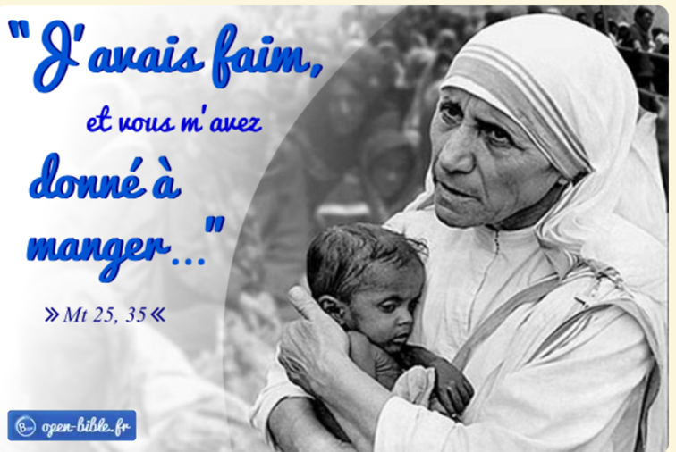 On peut se dire : beaucoup ont faim aujourd’hui et on ne peut pas nourrir toute la terre ! Mère Teresa nous répond encore : « Si tu ne peux pas nourrir cent personnes, nourris-en au moins une ». En gros, ce que nous pouvons faire aujourd’hui, faisons-le.