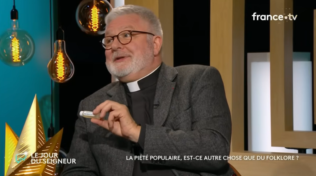 -Le père Michel Desplanches, recteur du sanctuaire Notre-Dame du Laus, présente l’huile guérissante que la Vierge Marie a invité l’Eglise à distribuer aux malades.