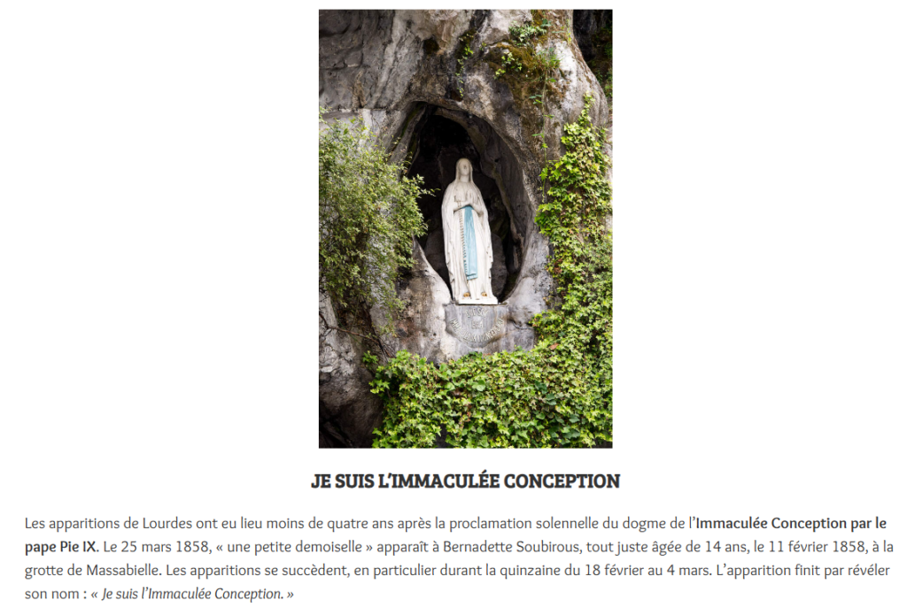A Lourdes, à la demande de Bernadette Soubirous, Marie a donné son nom : « Je suis l’Immaculée Conception ». Ce mot – que Bernadette ne comprenait pas – signifie que Marie a été préservée du péché dès sa conception. C’est unique dans l’histoire du salut.