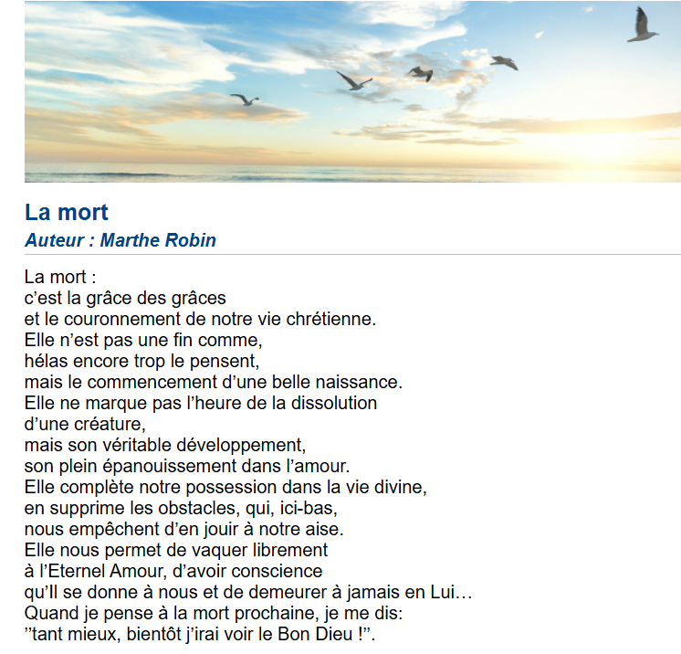 Personnellement, je ne savais pas faire grand-chose pour aider mon beau-frère mais je voyais qu’il appréciait que j’accompagne sa chère épouse.  « Tu retournes aujourd’hui ? » « Non, demain, mais une dame viendra passer la nuit près de vous. » Jean-Marie est mort la nuit suivante.  Il est vrai que j’aurais pu rester plus longtemps près d’eux. Je pense à la Vierge Marie qui, apprenant que sa cousine Elisabeth était enceinte malgré son grand âge, s’était mise à son service durant trois mois.