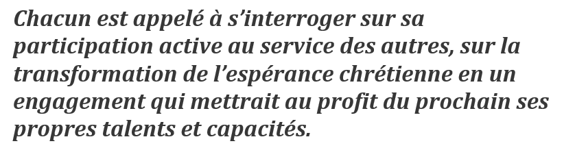 Personne cependant, ne peut édifier le bien ou sauver le monde seul, «Dieu lui-même ne le souhaite pas». Cette mission est à mener ensemble, «dans l’Église et avec de nombreux frères et sœurs».