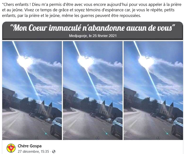 Dans sa grande douceur de mère, la Vierge Marie nous appelle vivement et incessamment à compter sur Dieu. Elle sait que par nos propres moyens nous n’arriverons pas à vaincre nos Goliaths. Dieu a un plan d’amour pour nous sauver. Ce plan est secret. Seules quelques âmes choisies savent ce qui va se passer. Marie le leur a révélé. Il est grand temps de s’informer ! Partie de Medjugorje, une Vierge pélerine circule dans nos villages. Faisons-lui bon accueil et surtout, tenons compte de ses recommandations en mettant en pratique ce qu’elle demande pour notre bien: confession, participation à la messe, prière du rosaire, jeûne et bien entendu: lecture quotidienne de la Bible.